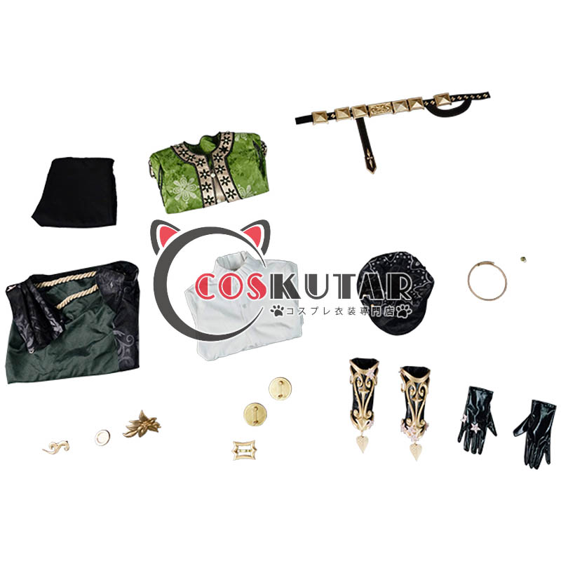 上着、インナー、マント、ズボン、飾り物(ベルト、マント飾り、手袋、腕鎧、帽子、首飾り、帽子飾り)