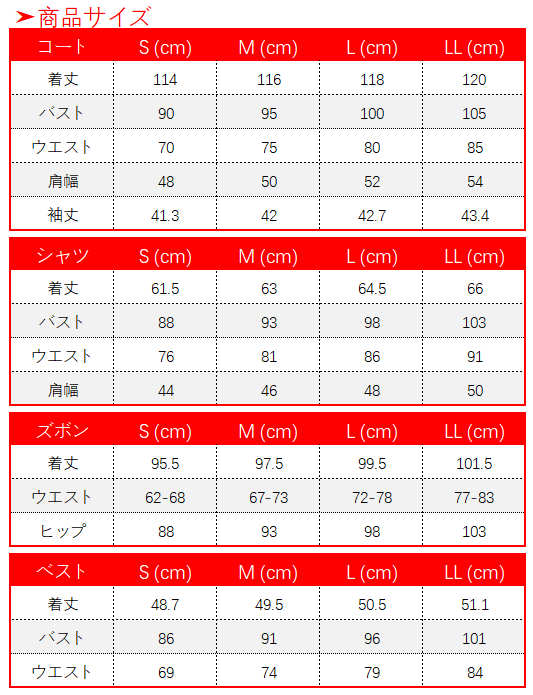 コート、ベスト、シャツ、ズボン、飾り物(ネクタイ、耳飾り、頭飾り、手袋、ベルト、腰飾り、腕飾り、ペン、腰鞄、サスペンダー、クリップ)