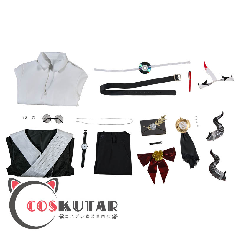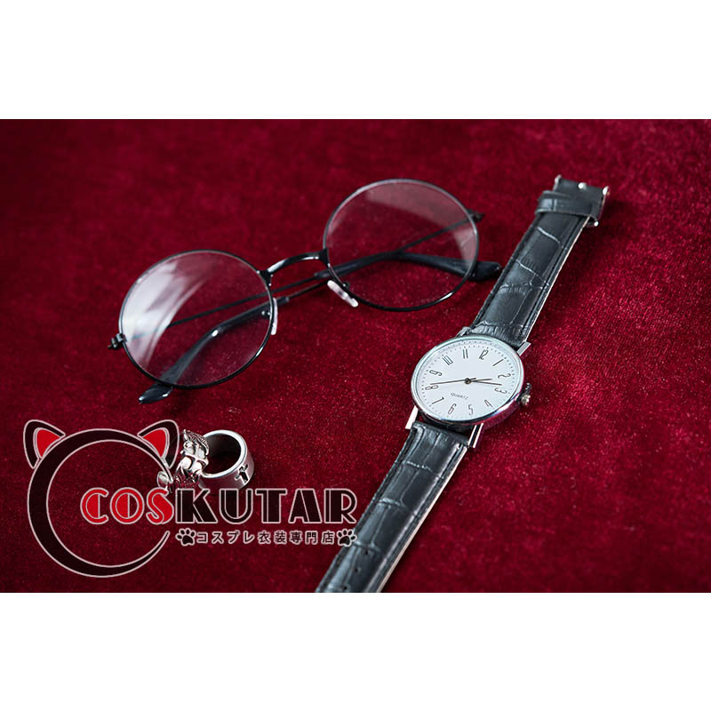 上着、ベスト、シャツ、ズボン、飾り物(ブローチ、頭飾り、封筒、メガネ、メガネセット、指輪2点、腕時計、ブラックバンド、タトゥーシール、ベルト)