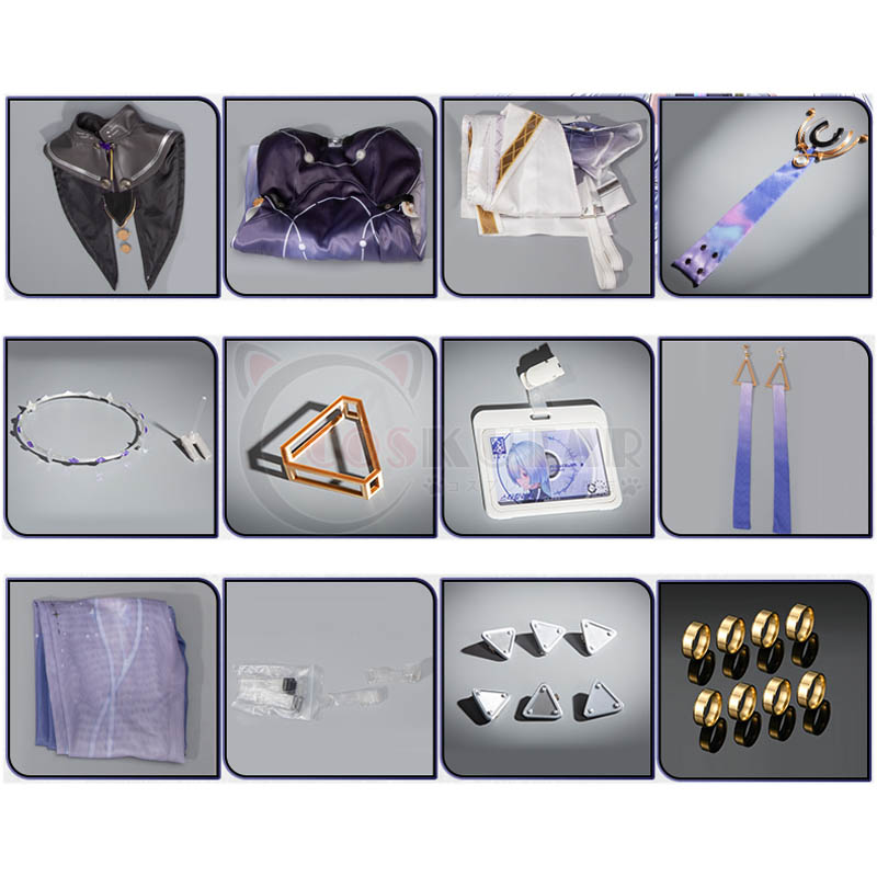 上着、スカート、ケープ、飾り物(胸元飾り、頭飾り、ブレスレット、名札、耳飾り、タイツ、肩紐、髪飾り、指輪、タトゥーシール)
