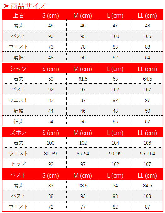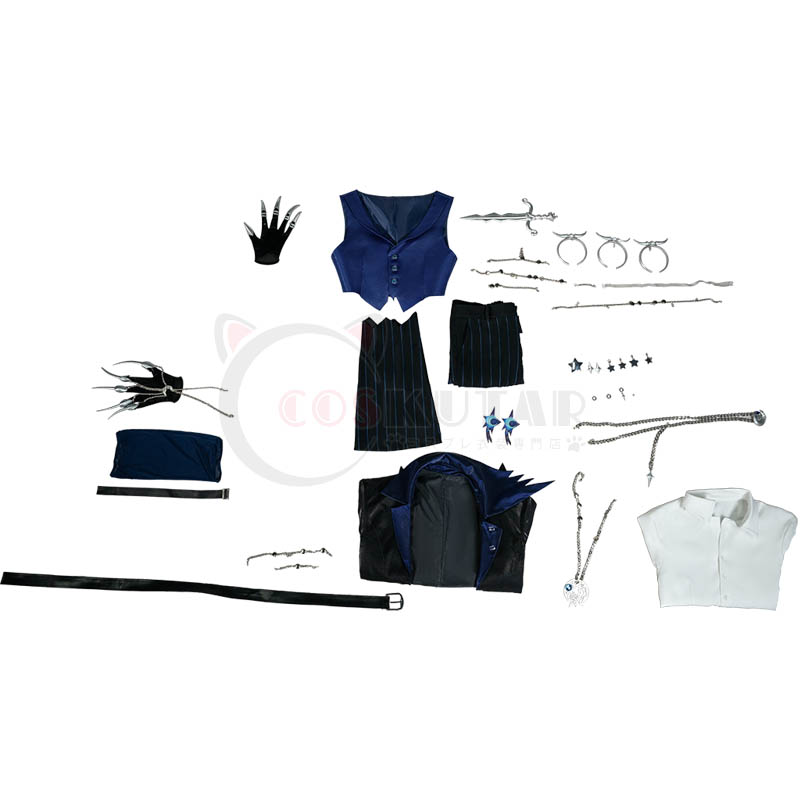 上着、シャツ、ベスト、パンツセット、飾り物(帽子、チョーカー、イヤーアクセサリーセット、アームリング×3、胸飾り、ダガーセット、チェーンセット、手袋、レッグカバー、ベルト)