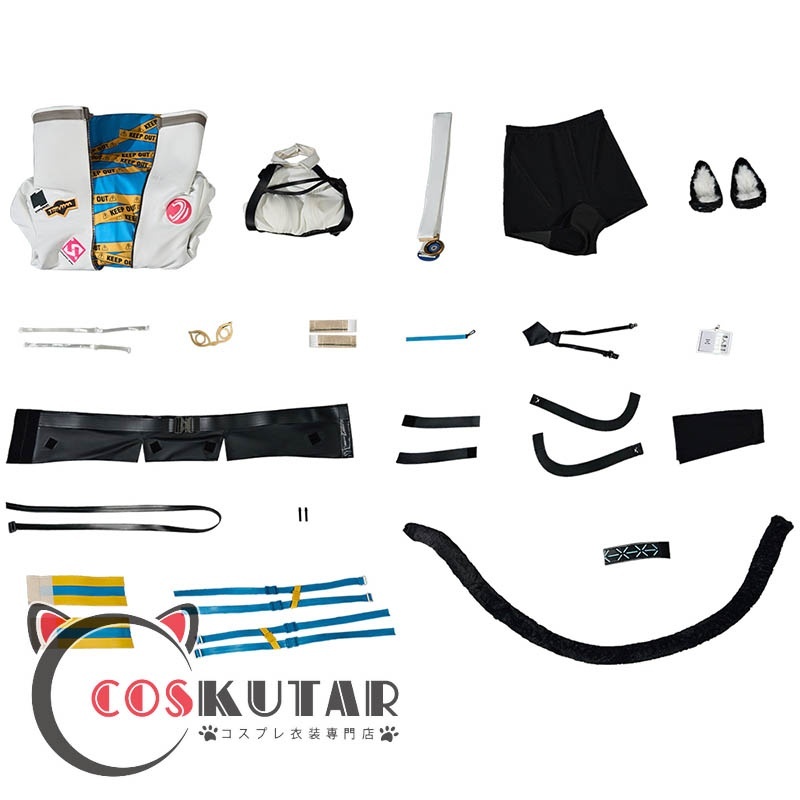 コート、ツナギ、インナーパンツ、飾り物(耳、肩紐、頭飾り、髪飾り、ネクタイ、名札、しっぽ、足首飾り、太もも飾り、靴下、ベルト)